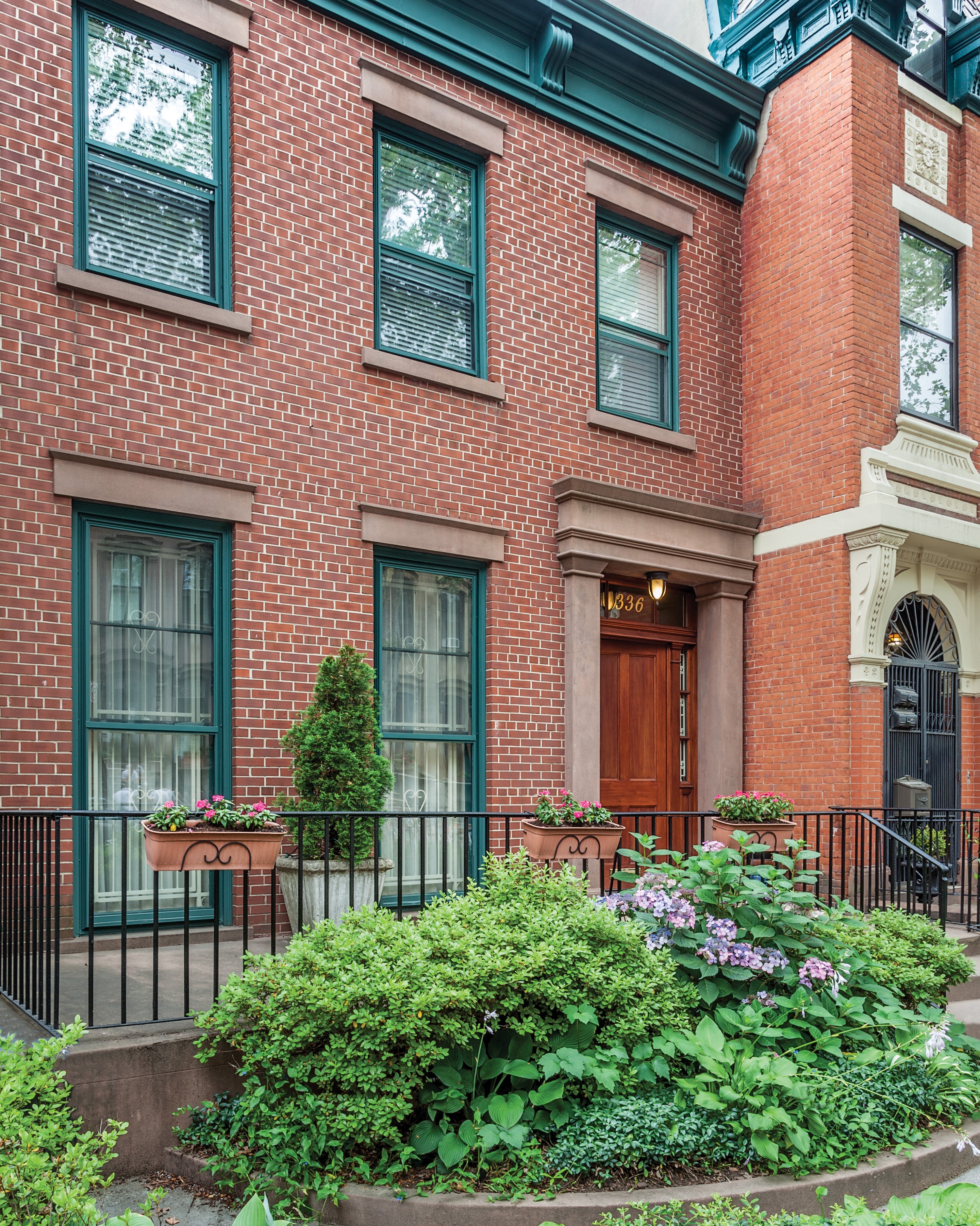 Our renovation included restoring the brick and brownstone detailing, adding a dark green cornice and trim, and designing a lush garden in the front yard.
