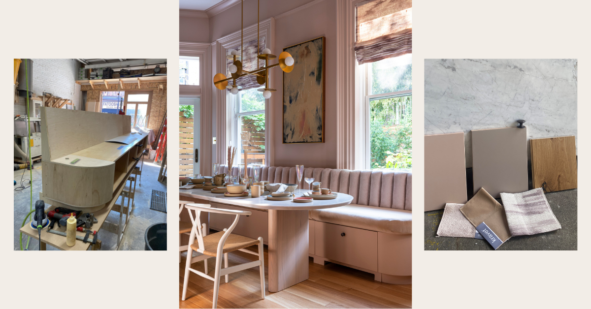 We designed a multifunctional area for cooking, gathering, and entertaining. The space is unified by both the island and banquette that spans multiple windows. The cabinetry, created in collaboration with Taffera Fine Building and Finishes, has simple but beautiful design details. We accented the millwork with decorative leaded glass, brushed finished stone slabs, and crafted upholstery that urge you not only to look but to touch and feel.