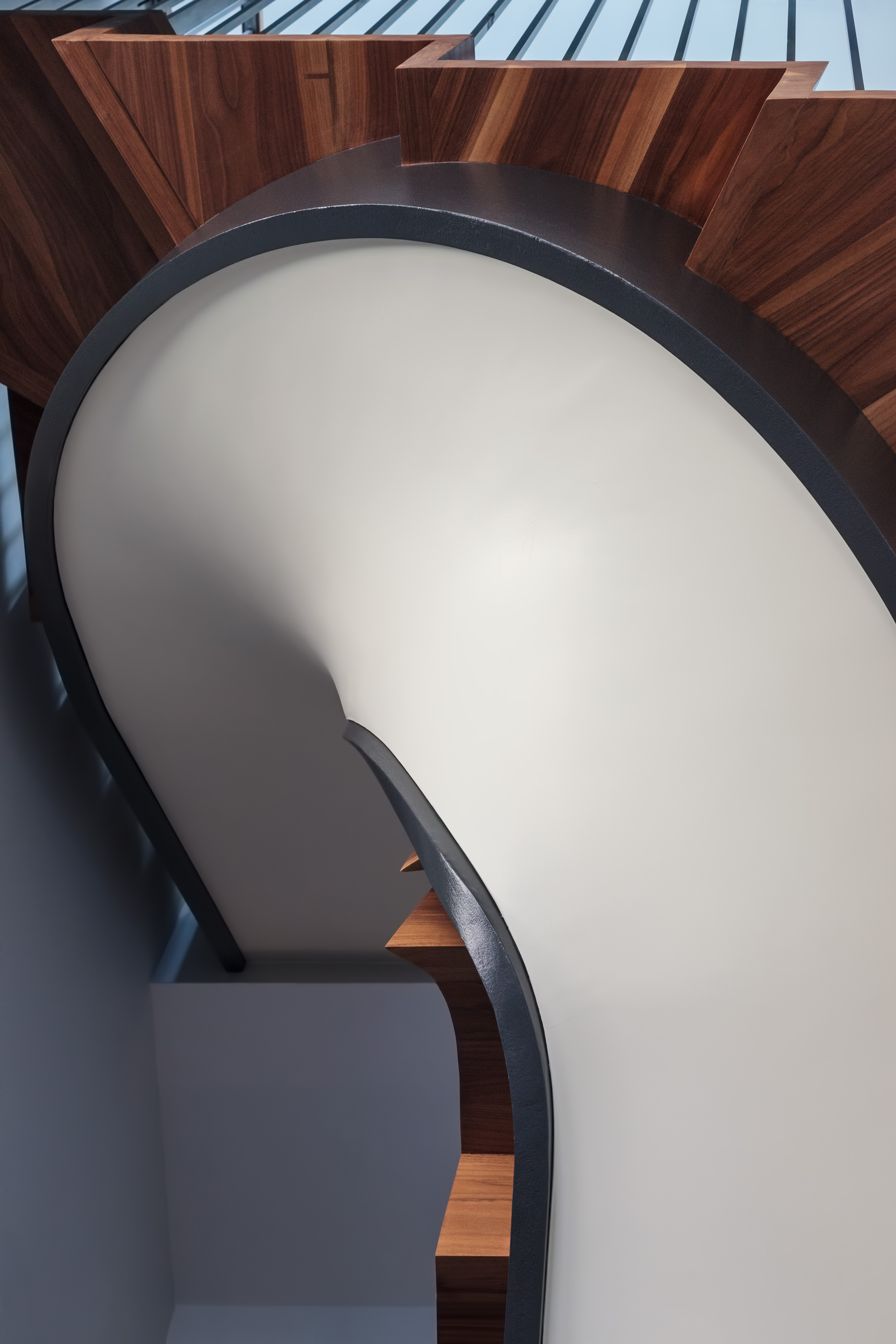 Walnut treads, custom bent steel stringers, and artfully curved plaster combine to create a striking staircase, beautiful when viewed from every angle.