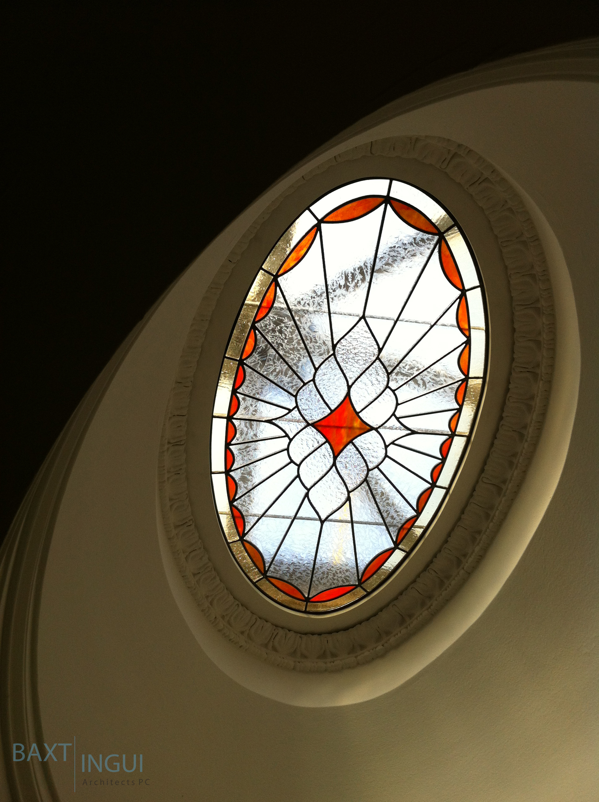As shown below, the decorative leaded glass sits atop the staircase, immediately below the skylight well. This configuration allows the leaded glass to remain safe from the elements and ensures that our team was able to include a better performing exterior skylight into the system.