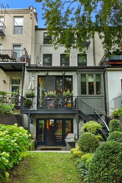 Fostering a strong indoor/outdoor relationship was important to transform the space. We enlarged the rear openings, adding French doors to the rear yard on both the garden and parlor levels, and added a bay window to the parlor-level kitchen. A new staircase connects the parlor-level rear deck to the yard below.