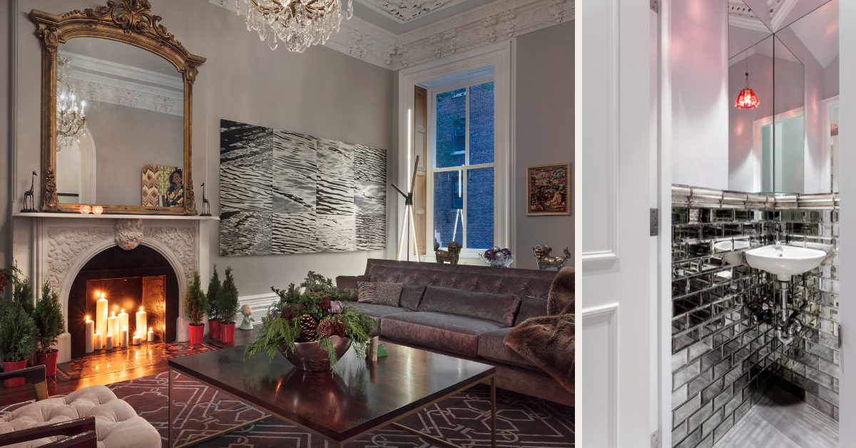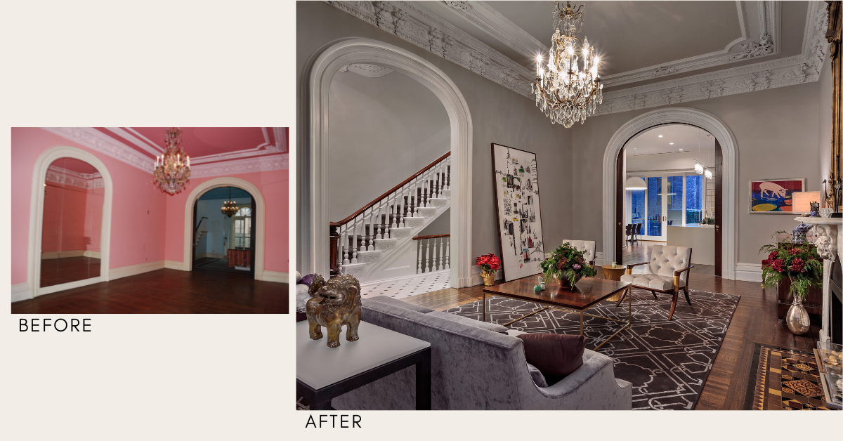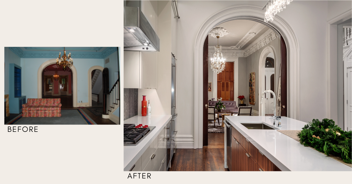 We reimagined classic details like hardwood floors, a dramatic fireplace and vintage chandelier, and historic crown molding.