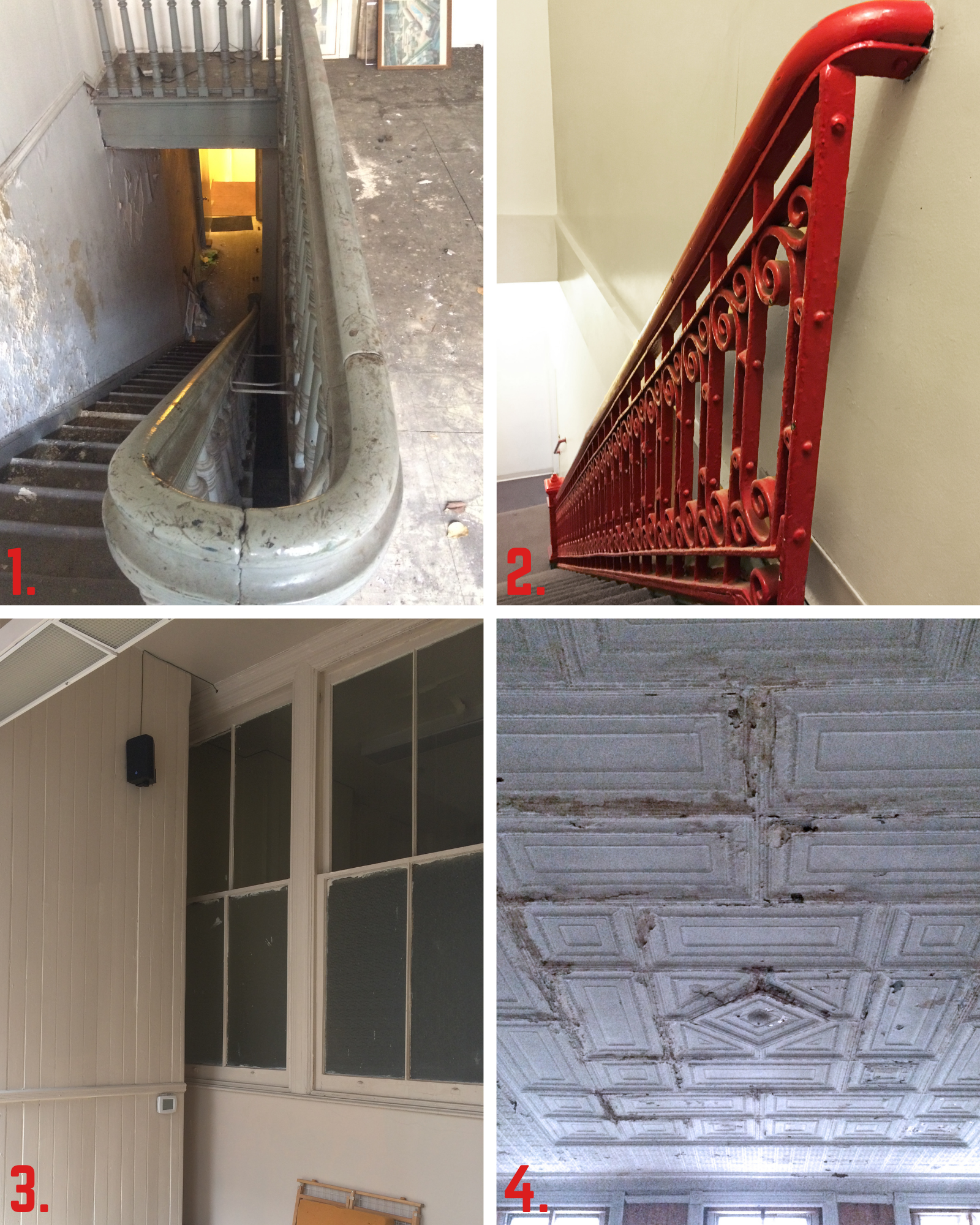 For example, the mezzanine in unit 3 will be furnished with a beautifully ornate wooden handrail and balusters that were original to Engine 16's third floor staircase (1). The original staircase on the first floor showcases a beautiful red, cast-iron railing that led from the garage to the firemen's quarters. The railing will be reinstalled in almost the same location (2). Other details to be reused include 9 ft. tall interior wood windows from the second floor, that likely partitioned off the firehouse chief's office. These will be repurposed as the separating wall between the second-floor tenant hallway and a new convenience stair with the railing described above (3). The original paneled tin ceilings will be carefully removed and reinstalled in each apartment's living spaces. These panels pay homage to the building's firehouse history and are no longer manufactured (4).