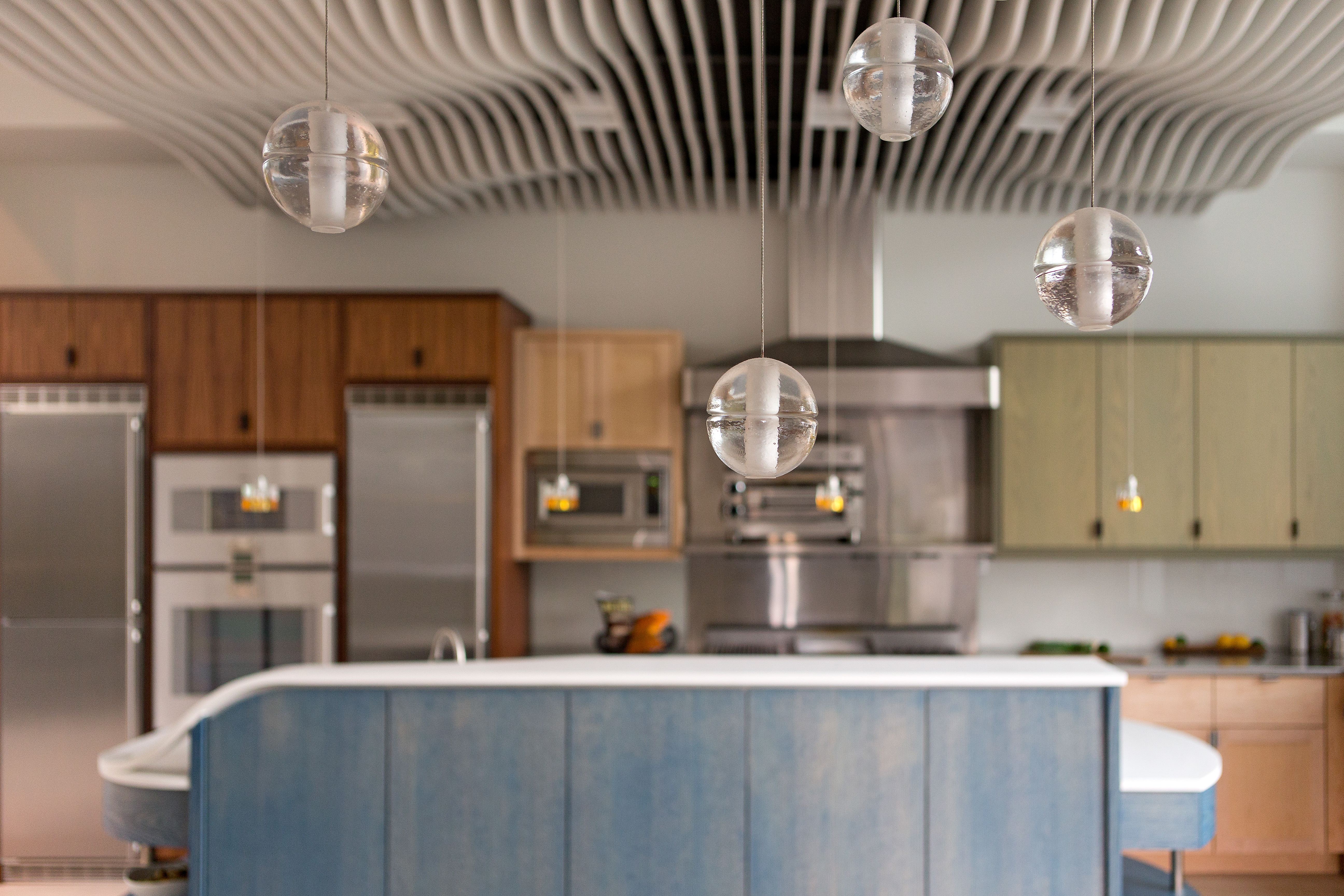 We opened up the home's main living spaces and designed a dramatic double height space. Large skylights above a floating staircase of wood, glass, and steel allow natural light to pour into the home.