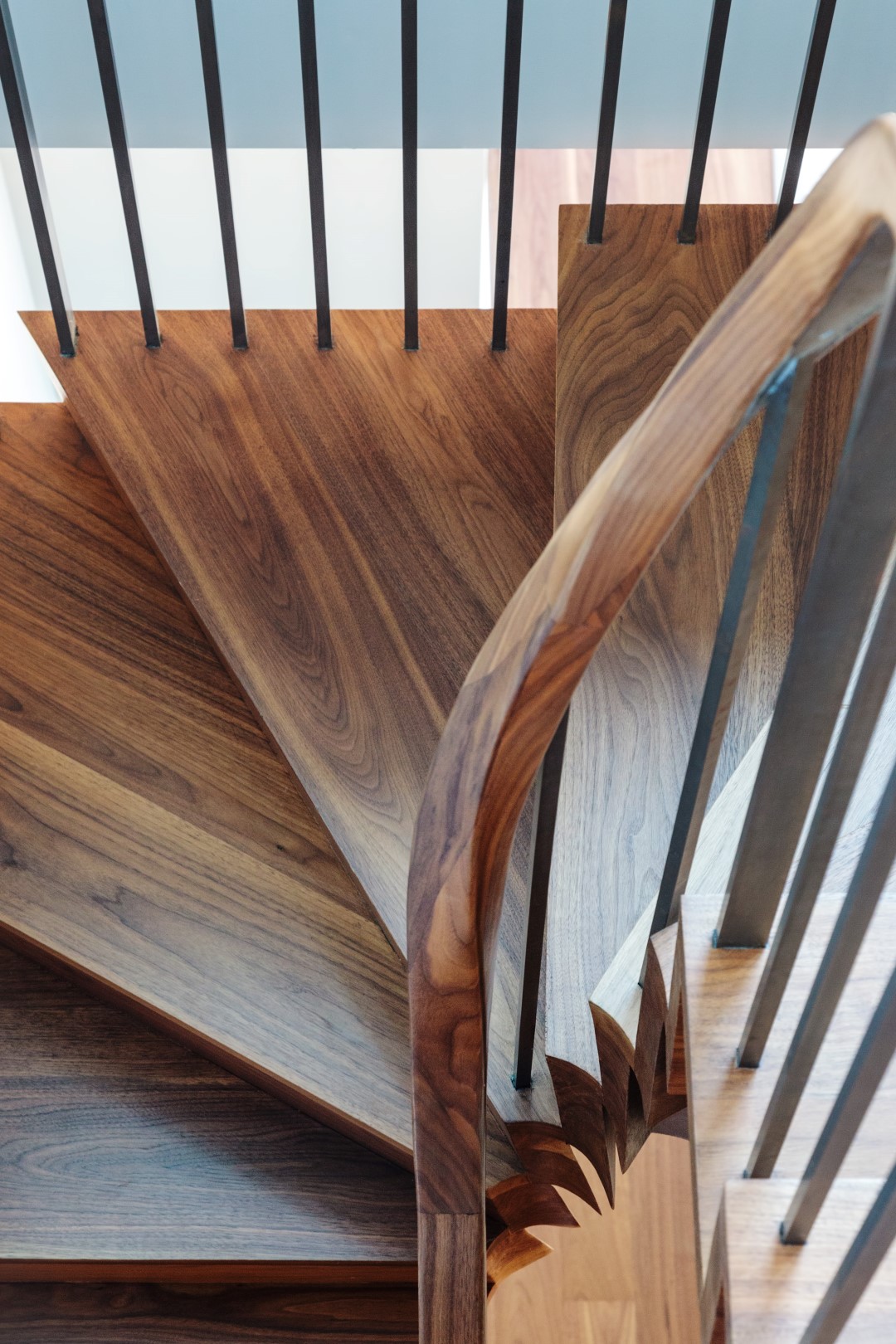 By replacing the existing tight, circular stair with a sculptural walnut stair we increased functionality without taking up too much space.